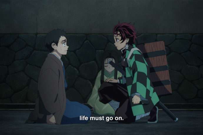 Interim , Tanjiro Kamado, Zenitsu Agatsuma, and Inosuke Hashibira determine to board the Eternity Wagon train and join Kyojuro Rengoku, who is the column of firing in their latest mission to vote out and kill demons.